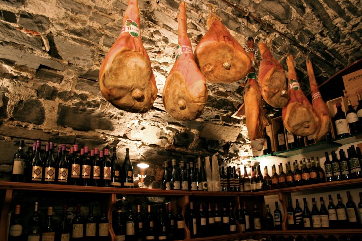 As we were on our own today, we took the ferry to Belaggio, the most commercialized and visited town along the lake. The “streets” are essentially cobblestone lanes crisscrossed by cobbled stairways, lined with businesses. Because the Lake Como area produces some of the finest silks in Italy, we purchased some scarves as gifts. A wine shop that we entered (Enoteca Cava Turacciolo) was advertising a wine tasting later that afternoon, which we would be unable to make. Legs of prosciutto di San Daniele were hanging from the ceiling, another air-cured ham like its Parma cousin.