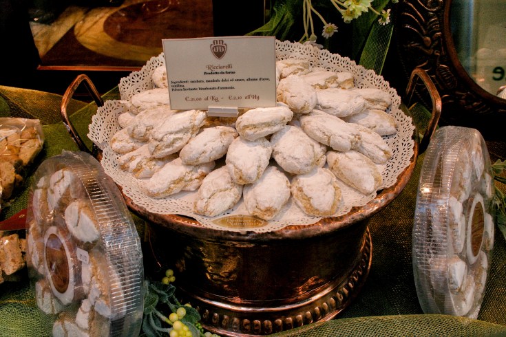 Panforte is Siena’s contribution to the confectionary world. Somewhat like a fruitcake (though nothing like the American kind), it is dense and chewy, containing nuts, fruits and spices and is sweetened with honey. But, for our money, we much preferred the cookie known as ricciarelli, a heavenly combination of almonds, honey, confectioners’ sugar and egg white, the latter lending it the most sublime, lightly chewy, definitely ethereal texture. It was our misfortune that we didn’t purchase a box of them to take with us to eat during our long bus rides.