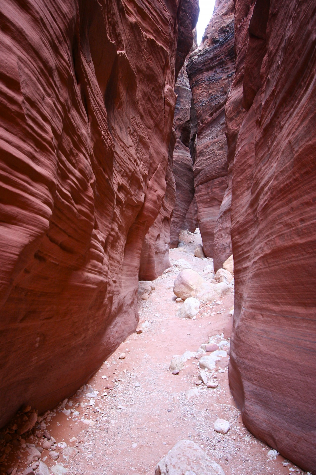 Our first experience with a slot canyon was Wire Pass in the Vermilion Cliffs National Monument south of Zion. We had a hard time locating the access road. Luckily, we came across the Paria BLM office beyond the turnoff and were given directions. The unimproved dirt access road, washboarded and rutted its entire length of over 8 miles, led to the trailhead. The first mile of the trail was pretty unimpressive (boring) over dry scrubland. Eventually, the canyon entrance came into view. Entering the slot is like going into another world. Suddenly, you’re enclosed by high rock walls; the effect is like nothing you’ve experienced before.