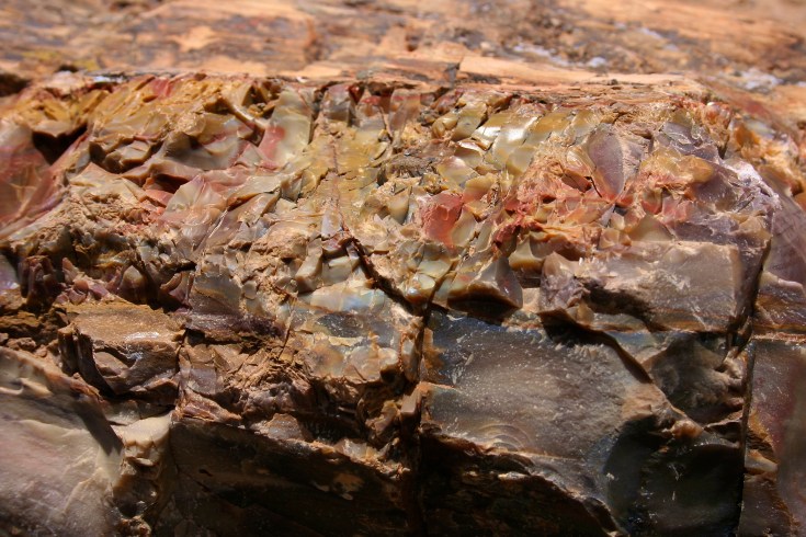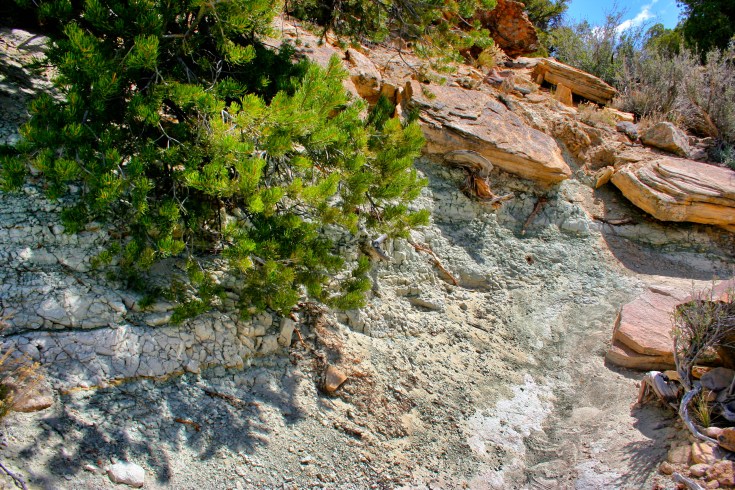 You don’t have to go to Petrified Forest National Park to see petrified wood. Along Highway 12, north out of Bryce Canyon National Park, we stopped at Petrified Forest State Park that has some splendid examples of petrified wood. As soon as you take the trail into the hills, you begin to notice some pastel-shaded soils of green, purple and gray. It looks like someone dumped a lot of colored chalk, when in fact these hills are eroded layers of mostly shale of a geologic layer(s) known as the Chinle Formation, where petrified material is typically found. This formation is found in great abundance throughout the Colorado Plateau.