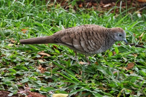 All over Hawaii, the zebra dove is found in abundance, scurrying along grassy areas and pecking at things on the ground with their beaks. Originally from Southeast Asia, they have become adapted to the islands. They have a very distinctive staccato-like coo of short but pleasant bursts. Although their plumage is brownish gray with striping along their breasts and flanks, they do have a bluish-gray cast on their faces with a more distinctive blue around their eyes. We heard them everywhere.