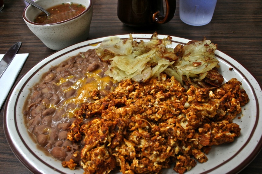 My favorite thing that I order from the menu—actually the only thing—is their chorizo and eggs (☆☆☆☆), generous amount of chorizo sausage scrambled with eggs. What I love about it is, aside from the excellent chorizo, the eggs and meat are nicely blended, almost fluffy, rather than pebbly like at some restaurants. When slathered with their killer salsa that’s served on every table, you have a meal fit for a real king. There are several other Mexican (and American) breakfast options, including specials of the day written on a blackboard, but I’ve never tried ANY of them, so enamored am I of my ‘usual.’