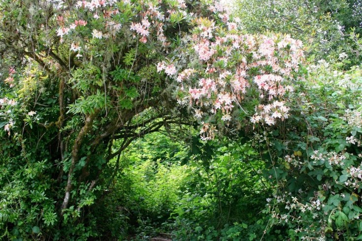 One of the glorious native shrubs that grows along the coasts of California and Oregon is the western azalea. It is really not an azalea, but rather a rhododendron, a deciduous one at that. When in bloom, the shrub is very prolific. Since it was late spring, our road trip coincided with its peak blossoming period. We didn’t plan to seek it out, but as we pulled into Prairie Creek State Park, we noticed a number of them just outside the visitors’ center. As we approached, we caught their characteristic heady perfume well before we got a closer look at the flowers. It was an unexpected treat.