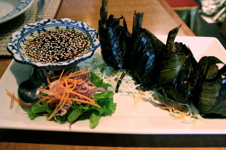 From their specialty list, we ordered chicken in pandanus leaves (gai hor bai toey). Boned chicken thighs are marinated in a secret garlic sauce, shaped into little drumettes, then tightly wrapped in pandanus leaves and deep-fried. They’re served on a bed of very finely shredded cabbage and come with a sweet dipping sauce. How can I sing their praises? The leaves protect the chicken from getting too oily; they essentially steam in their own juices and marinade. Not only was the presentation marvelous, but the first bite into these tender morsels, exploding with flavor, was enough to forswear my allegiance to any other Thai restaurant.