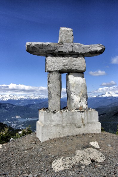 Outside the Whistler Mountain restaurant, there is a large inukshuk made of stone pieces, mounted on a concrete foundation and otherwise not visible from the gondola station.