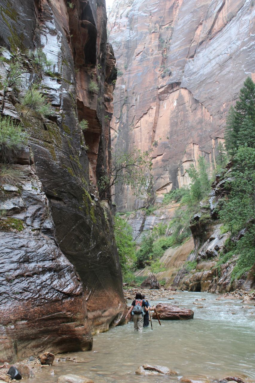 Today, we finally got to hike The Narrows. First, we rented equipment from a local outfitter in Springdale, which included wooden hiking poles, waterproof boots and neoprene socks. The day didn’t start off so promisingly. A light drizzle was beginning to fall. Sucking it up, we decided to go ahead. The first step into the river took some adjustment, getting our feet entirely wet since the shoes and socks would do little to keep water out. The next mental and physical adjustment was getting used to walking on smooth, slippery rocks, most bigger than your feet, which meant that often we were struggling to keep our ankles straight. Hiking poles helped. I was certain that even the light precipitation overhead was accumulating in the river with thin sheets of water cascading down the canyon walls to raise the water level and boost the power of the current.