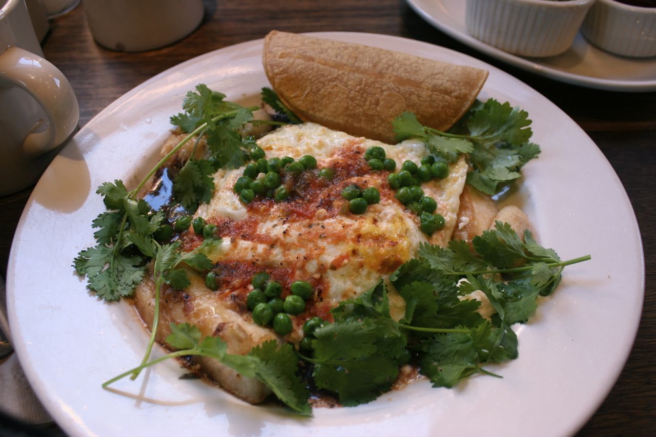 We had breakfast at one of the legendary restaurants in Santa Fe, Cafe Pasqual. The portion being large, we split the highly recommended Huevos Motuleños, easy-over eggs on a bed of black beans, topped with feta cheese and served with corn tortillas and sauteed bananas. This was a major disappointment (☆☆). First, the eggs were cooked hard. The black beans lacked flavor and were a bit hard; they could at least have cooked them in salted water. The corn tortillas were dry. And the sautéed bananas really didn’t add anything at all. We always order the salsas on the side so my wife can decide if they’re too spicy or not. What this means is that the dishes we order have to stand on their own. This egg dish didn’t. The overall impression was blandness. About the only thing going for it was that the ingredients were organic (almost all Cafe Pasqual’s ingredients are). The salsas were very good, including a tomatillo salsa (☆☆☆) that had flavors of cilantro and vinegar. I hope that future visits will not disappoint as much as this one did.