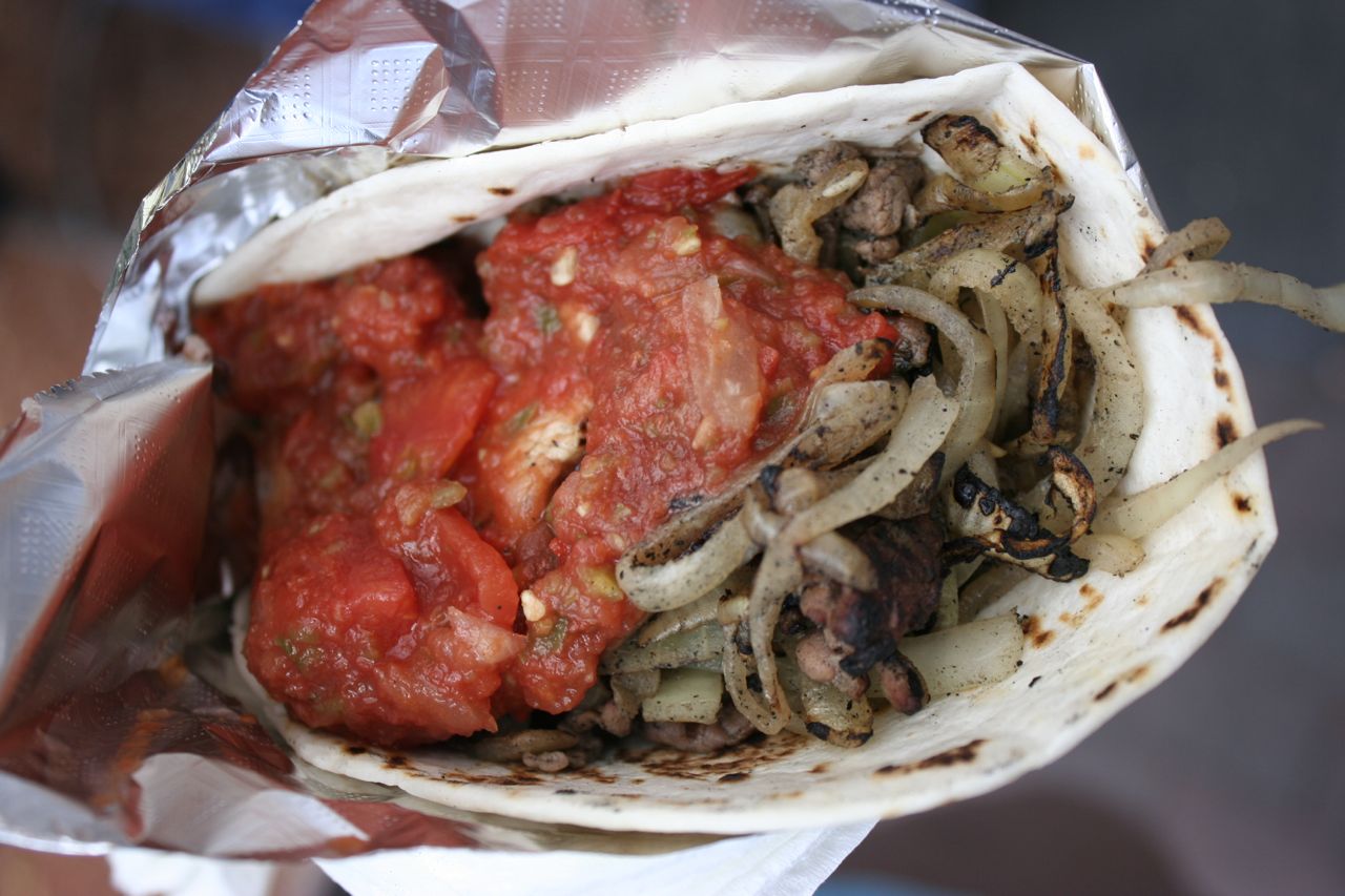 One of the cult foods in Santa Fe is the beef carnitas from Roque’s wagon, parked at the edge of Santa Fe Plaza. A whole half pound of sliced marinated beef top round is grilled with onions and green chiles (I’m presuming Hatch), picking up a smoky flavor, then piled into a large flour tortilla, topped with salsa, all rolled up in aluminum foil.