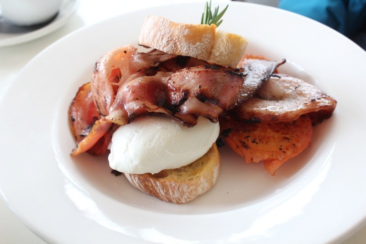 The bacon and egg that my wife ordered were expertly prepared, including a perfect poached egg, served with toasted ciabatta and grilled tomato.