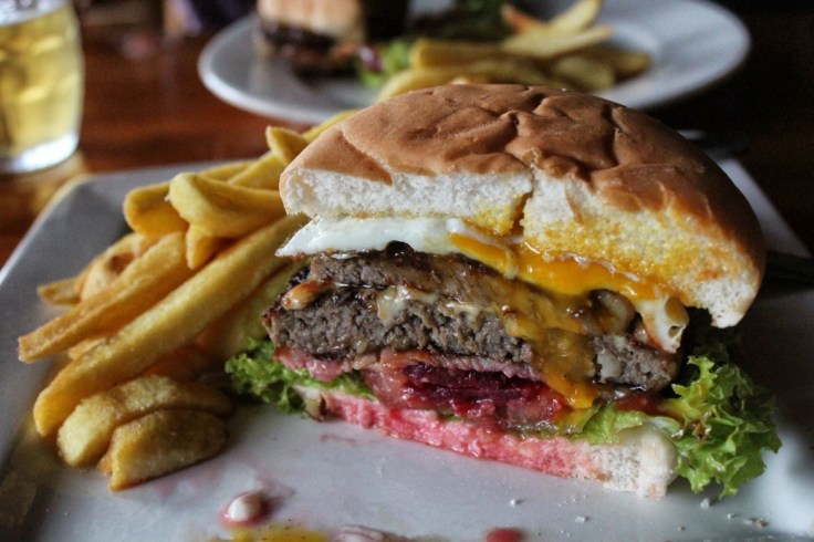 We split a Crusty Burger, a splendiferous version of a NZ-style burger: beef patty, steak, tomato slice, lettuce, fried egg, pickled beet (here called beet root), slice of cheddar cheese (here called tasty cheese). The ingredients are over-the-top perhaps, but the burger pleased my mouth.