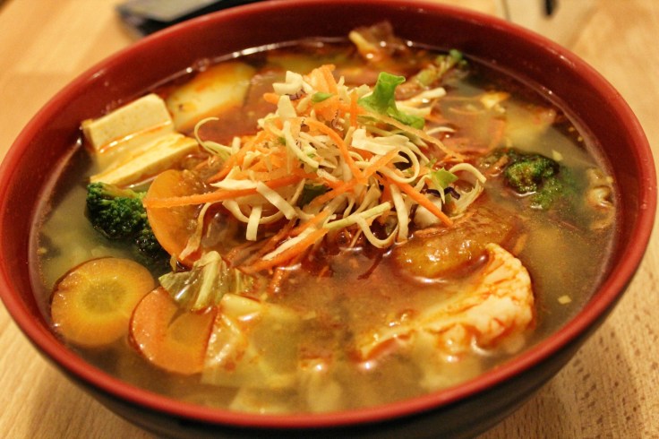 The broth in the Spicy Laksa Noodles with Vegetables was very tasty and spicy, a meat-based stock though the dish had no meat in it. Depending on what’s available at the grocers, the vegetables may vary. Since this was the dead of winter, today’s selection included broccoli, cauliflower, carrots and sliced radishes, with tofu and shredded carrots and green cabbage as garnish. The picture on the wall showed a garnish of cilantro, but there was none today since there wouldn’t be any available for another few months yet.
