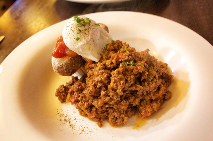 On the regular menu is Melba Mince, a savory ground meat sauté on toasted ciabatta bread, topped with a poached egg. I’d never had anything like this before, but I did enjoy it, even if I couldn’t identify the meat.