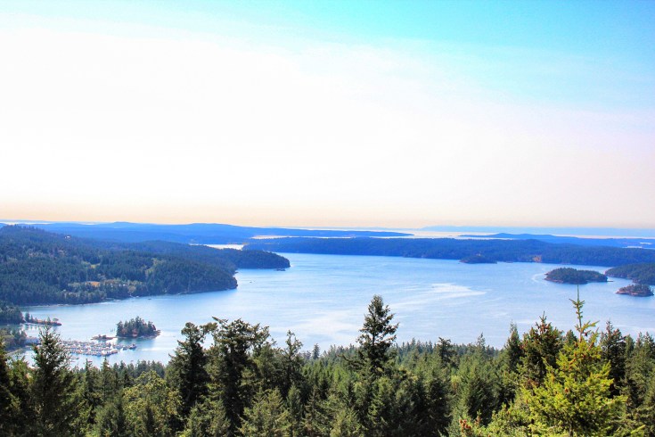 We took the south trail that led to magnificent views of the western half of Orcas Island and the Canadian Gulf islands. The trail eventually veers off the ridge and into the forested area. The temperature was ideal for hiking, in the lows 70s, and perfect for a picnic lunch overlooking the waters to the west.