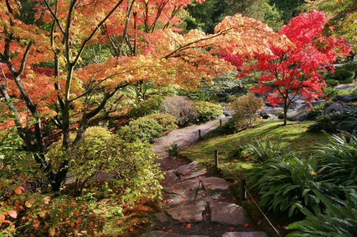 The Seattle Japanese Garden, nestled in the Washington Park Arboretum near the University of Washington, is beautiful at any time of year, but never more so than in the autumn, when brilliant fall colors run riot among the Japanese maples. In the past, we never managed to visit the garden at the right moment when the trees are at their colorful peak. This year, the Pacific Northwest was blessed with an extended summer of clear skies and warm daytime temperatures that lasted into the middle of October, coupled with cold evenings, those together the recipe for a potentially brilliant display. It did not disappoint. We had no intention today of visiting as the forecast was for showers and thundershowers throughout the day. But when we noticed after breakfast that there were sun breaks through the cloud cover and no precipitation, we jumped in the car and headed for the garden.