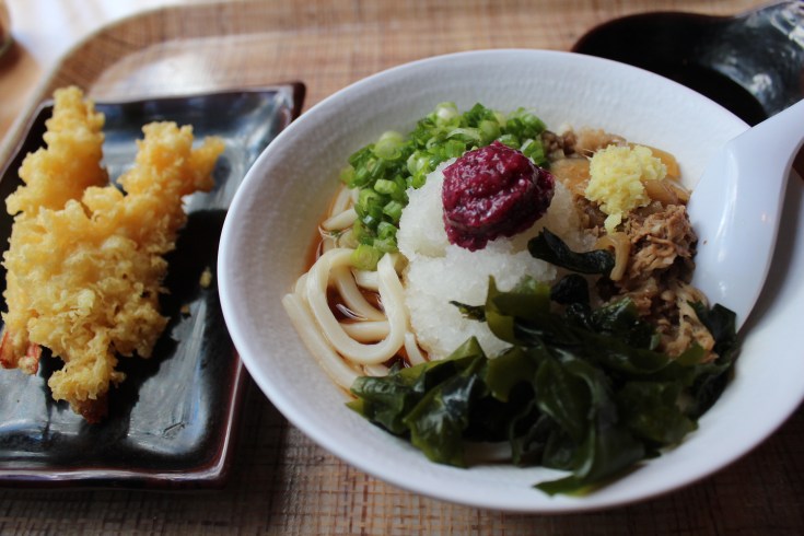 The broth for the niku-ume-oroshi udon is a tad sweet, presumably to counter the puckering saltiness of the minced pickled plum (umeboshi), though the broth is rich in flavor. It was accompanied by sliced beef (niku), seaweed (wakame), sliced green onions, grated horseradish (daikon oroshi) and grated ginger.