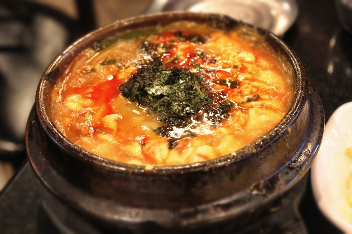 Update: (2-12-13) After struggling with a stomach bug for a couple of days, I wasn’t sure that exposing my system to the chiles of kimchi and soon dubu was the best idea, but earlier in the day I had just finished watching a Korean movie where some of the characters were eating. This wasn’t a food film by any means, but the idea of eating Korean food stuck in my mind. So, I invited a friend to tag along for dinner. We wound up splitting the bulgogi soon dubu and Sweet-and-Spicy Pork.