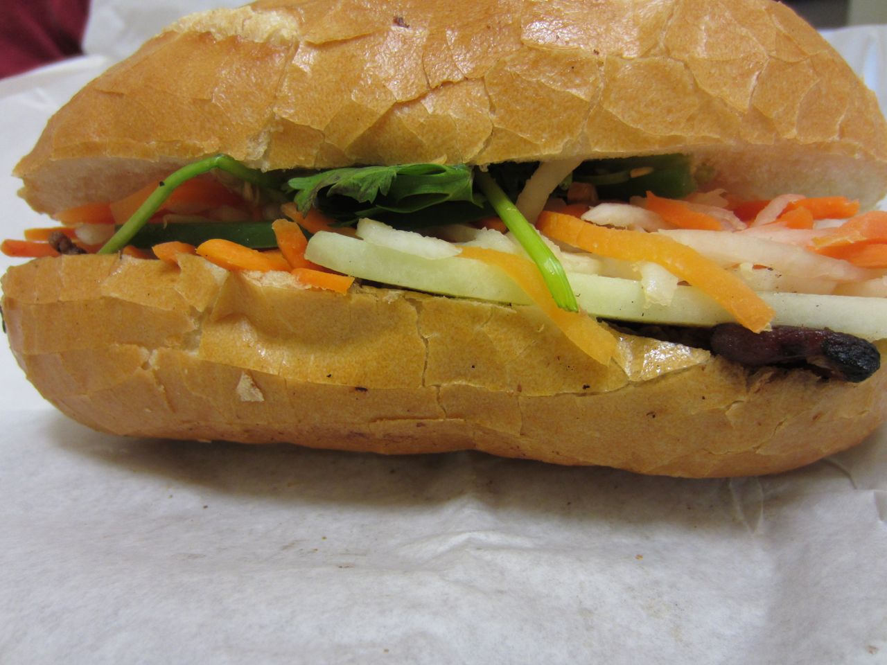 A friend of mine and I decided to check things out. The restaurant is located in a strip mall west of Fred Meyer, so parking is not the problem it is in Little Saigon. Inside there are tables for eating in, though not many, all lined up along the south wall in the skinny interior space. The entire menu is sandwiches, not only banh mi but also pastrami, Philly cheese steak and BBQ beef brisket. Whether the last three are riffs on the traditional classics, I might never find out.