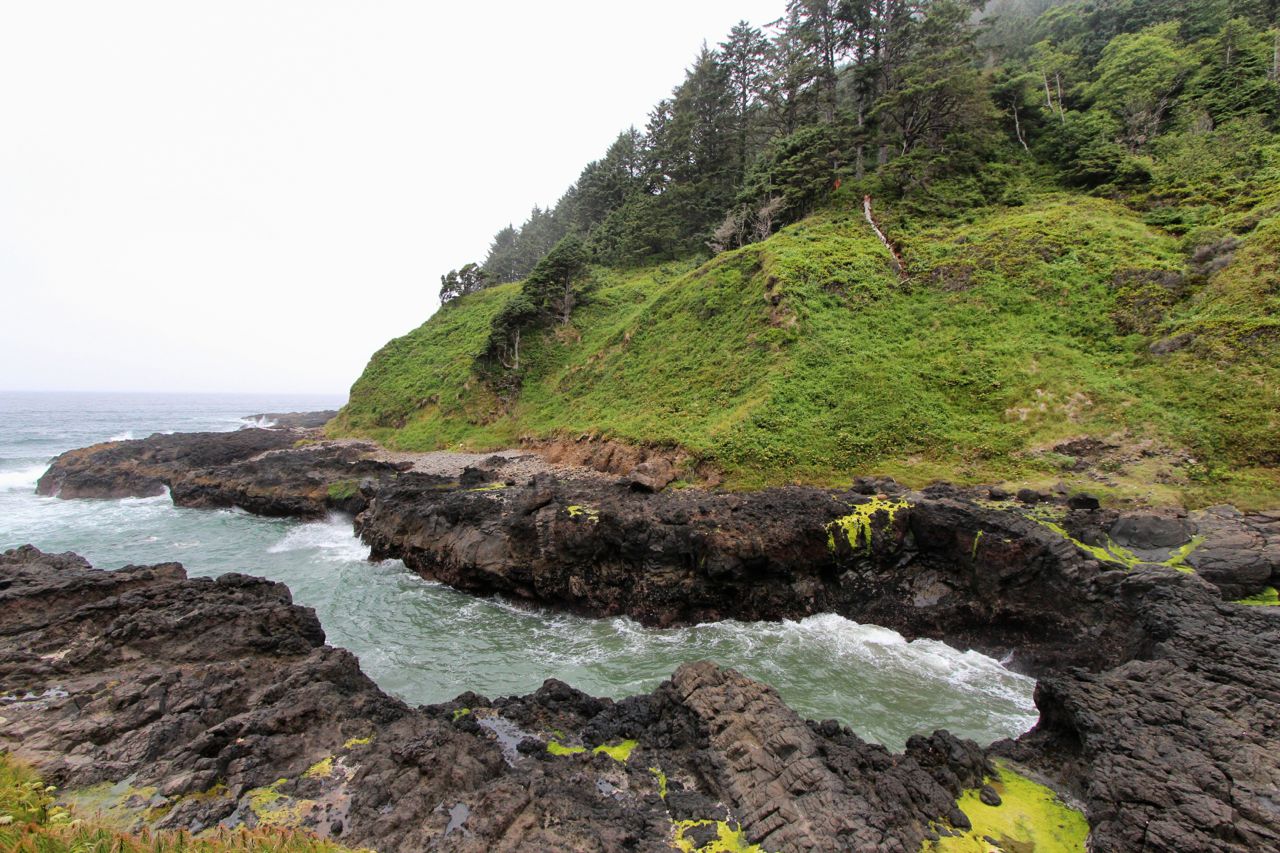 One of the most thrilling shows along the Oregon coast is the Devil’s Churn, part of the Cape Perpetua Scenic Area. At high tide, or better yet when there is a windstorm, waves of water come crashing through a narrow chasm fractured out of the basalt. As you can imagine, under “ideal” conditions, great plumes of sea water spew up with tremendous force, enough to make it dangerous to be standing near the edge. On less dramatic days, the waters still splash up along the sides of the chasm and swirl violently offshore. There is a short footpath down to the attraction from the parking lot above.