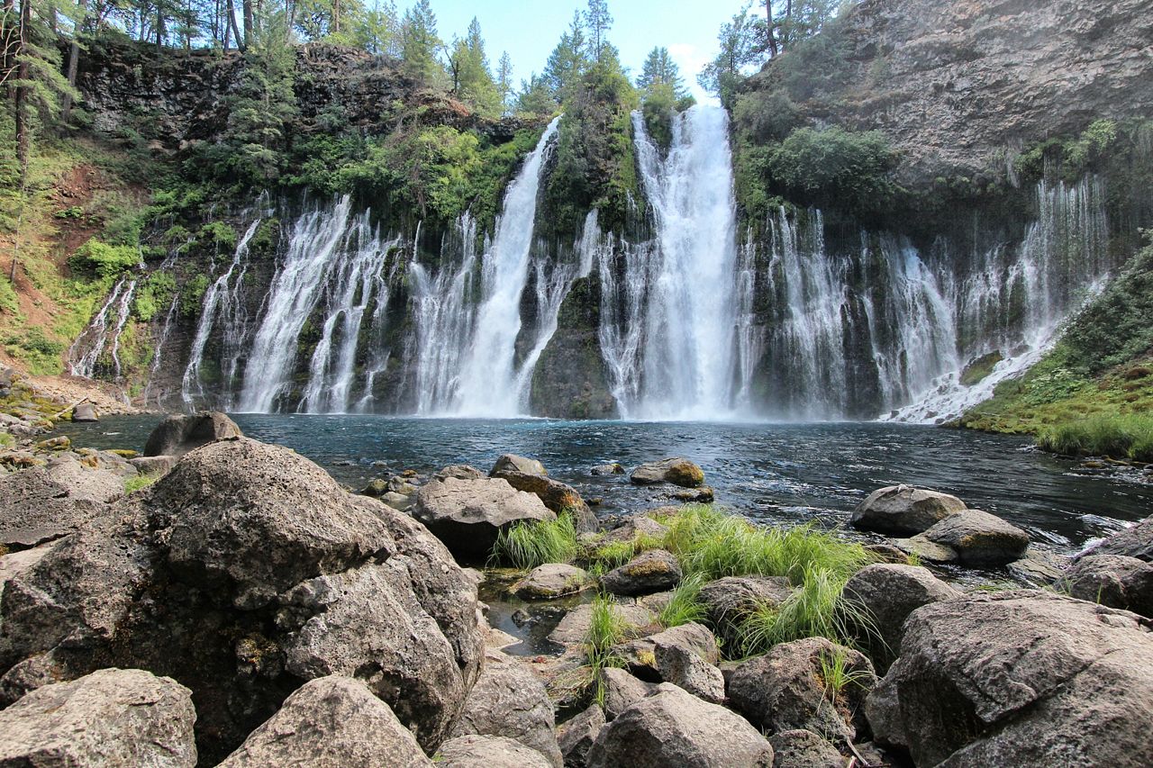 Often described as one of the most beautiful falls in the world, 129-foot Burney Falls is accessible in a state park far removed from a major thoroughfare. Continuing northward along Highway 89 in California, we wanted to make the falls a stopping point. Meltwater from Burney Mountain makes its way down through the porous volcanic rock (basalt) down into underground aquifers. Some of the water is forced above ground about a mile up from the falls and forms Burney Creek, while the rest of it moves through the underground reservoir and out the openings in the cliff face. If you look squarely at the falls, the water seems to originate not only from above but also from the rock wall. Even when the creek dries up during the summer, water continues to flow because of these underground channels. The flow rate is estimated to be 100 millions gallons per day.