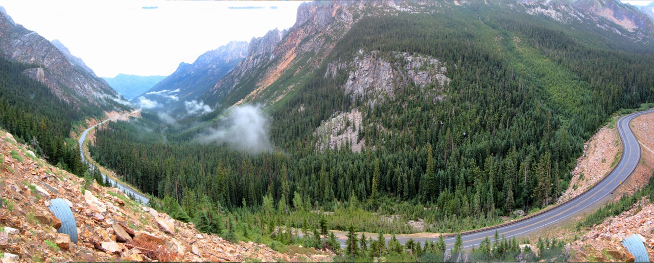 Even with low cloud cover and light fog obscuring the surroundings, I was tempted to stop or at least slow down often and take good looks. There are several turnouts to get better (and safer) views than craning your neck while negotiating the bend. But without doubt the best place to get a higher altitude panorama of the surroundings is the Washington Pass Overlook (mile post 162), only a short distance further up after completing the turn. The loop trail is short and has many surprises, including sections of the path that hug the edge of the precipitous stone outcropping on which the trail is built and, most spectacularly a magnificent view of the twisting highway, Early Winter Valley, Kangaroo Ridge and the towering craggy peaks that include Liberty Bell.