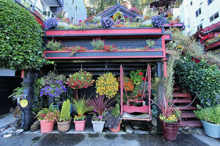 Among the sea of high-rise condominium buildings that line Harbor and Alki Avenues, I have to give “thumbs-up” to cottages holding out against development. Two adjacent buildings that caught our eye were festooned with pots, hanging baskets and planter boxes filled with flowers and other plants, looking more like enthusiastic garden projects than homes. A plaque on both structures indicated they were wildlife habitats certified by the National Wildlife Federation. As we were admiring them, one of the residents was returning home and informed us that caring for the plants is a shared responsibility among the tenants/owners and that in fact all sorts of wildlife do visit, including many birds and river otters.