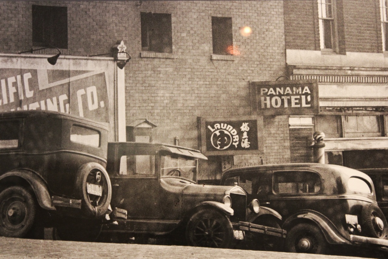 We’ve rarely regretted taking an organized tour, even of places with which we are familiar. So, we took one (“Touch of Chinatown”) sponsored by The Wing Luke Museum. The tour began in the Tateuchi Story Theatre where Don, our wonderful and knowledgeable guide, set the historical stage for the tour to follow. He pointed out the 15x30ft scrim that hung from the stage, the long-lost curtain from the Nippon Kan Theatre that only had a brief life (1909-1915) as a fire barrier between the backstage and customers. The scrim was unashamedly an advertisement medium of a grid of 48 squares (6 down, 8 across) on which a merchant could pay for advertising space. If the merchant was in arrears, his advertisement was rubbed out. In position #3 is a plug for Maneki, a restaurant that amazingly still operates today and considered the best Japanese restaurant in the ID.