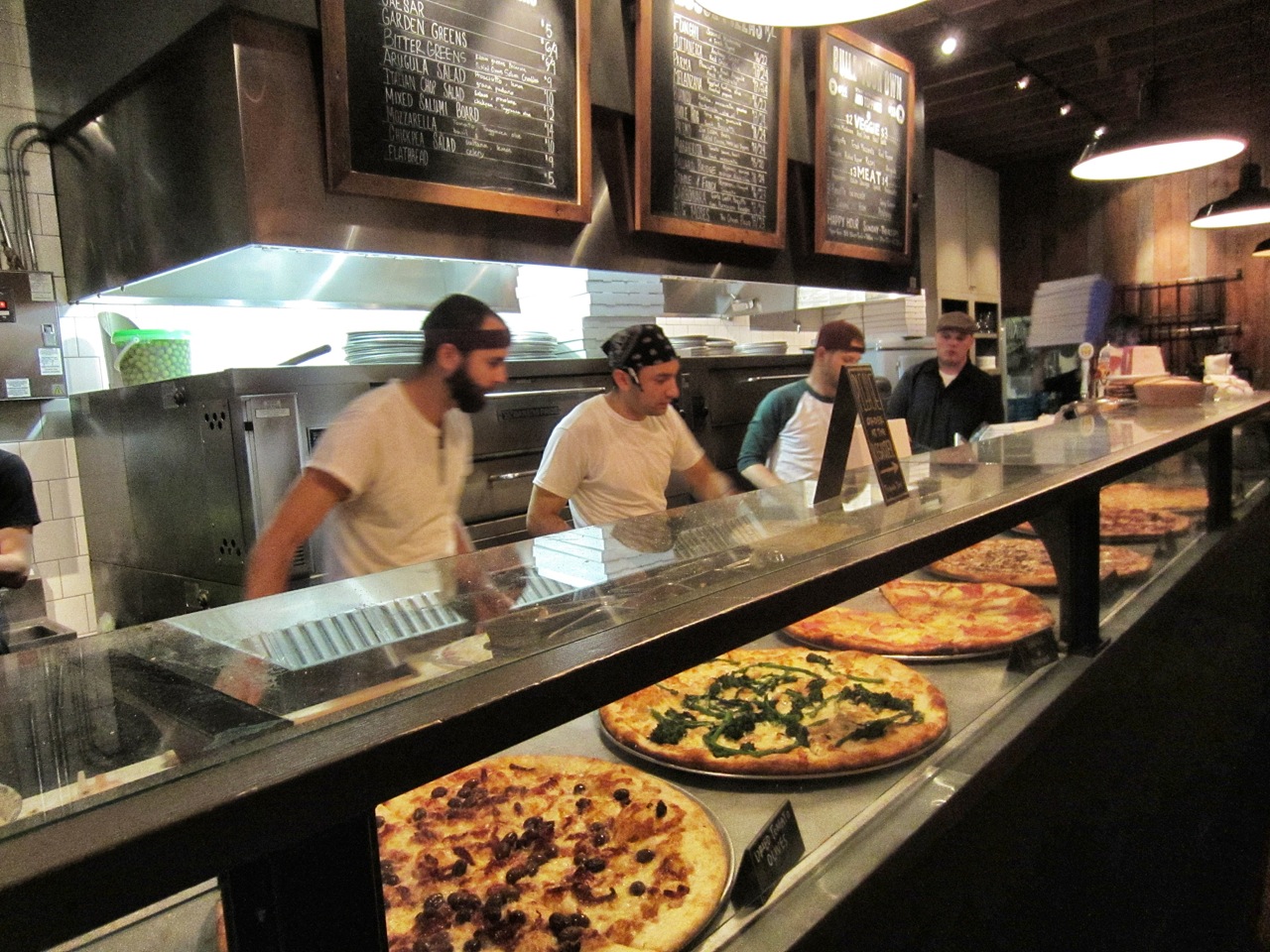 You can order a whole pie or a slice of pizza. But what a slice. Called a “fat” slice, it is one-sixth of a pie for $4. You can see what’s available along the kitchen-assembly line as you walk toward the cashier at the rear. Add a pint of one of several beers on tap, the combo should be enough to satisfy most modest appetites and eaten at one of the butcher block tables in front. Sit-down tables are reserved for whole-pie customers. For variety, there are several kinds of salad and pasta.