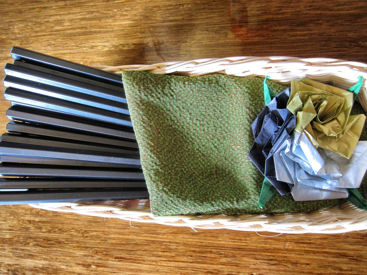 The lacquer boxes, which are traditional, had five partitions. The smallest held a square of Ota tofu, made locally with non-GMO soy beans and no chemicals, topped with a squirt of sweetened, house-made miso sauce. The largest section was filled with a choice of steamed brown rice or brown/white rice mixture, sprinkled with toasted black sesame seeds. Occupying another partition was a salad—mixed greens, sliced raw beet, shaved carrot, barley grains, and hijiki (a kind of sea vegetable) lightly dressed with a ginger vinaigrette. The fourth section contained a combination of a slice of cold red bell pepper tempura, tamagoyaki (grilled egg) and chard goma-ae (blanched chard with ground sesame seed sauce). The last compartment is reserved for the main course, in my case, pork tonkatsu and my wife’s, shio koji chicken.