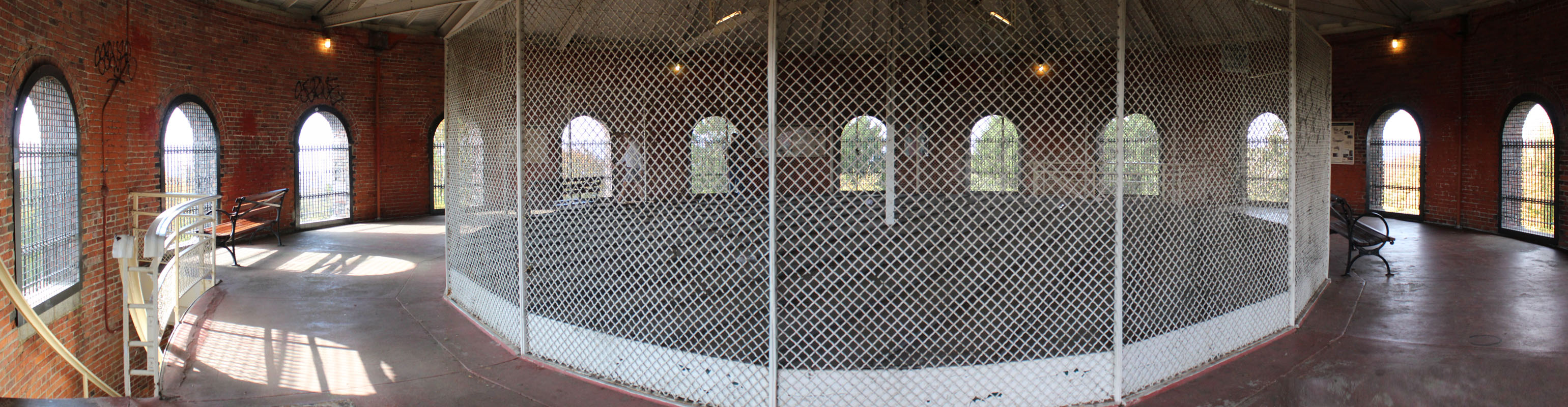 On the southern end of the park is a 75-foot water tower. We climbed its 106 steps (which made 494 for the day), arranged in a helix (one of two sets of stairs), to the observation deck that has sixteen windows with commanding views, partially obstructed by thick mesh wire, and informational panels about the Olmstead Brothers and the Seattle park system.