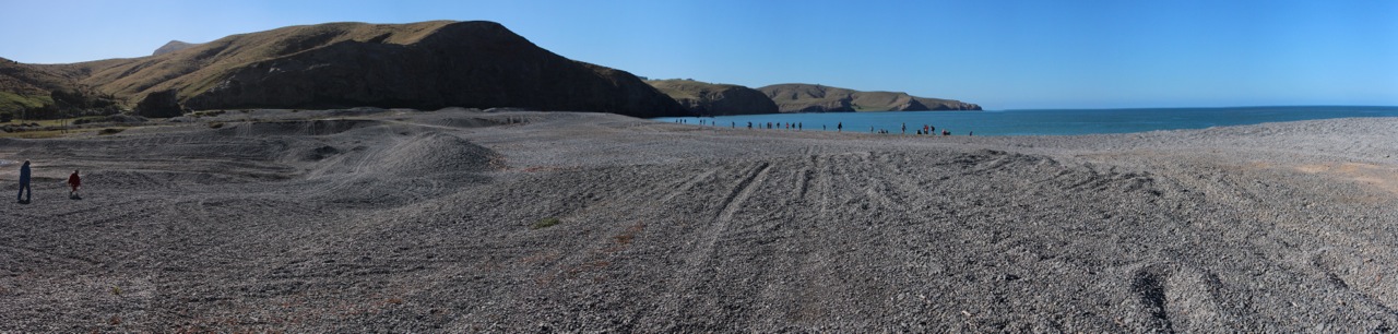 The drive to Akaroa passes by the Kaitorete Spit. Although not technically part of the Banks Peninsula, the spit juts out from its southwestern tip for 25km, separating shallow Lake Ellesmere, larger than either harbor, from the sea. Two weeks ago, we visited Birdling’s Flat which can best be described as a pebble beach. Rockhounds come here to find agates and geology students from UC to identify rock samples. My geologist son-in-law explained to me that this vast accumulation of rock was deposited by a tsunami.