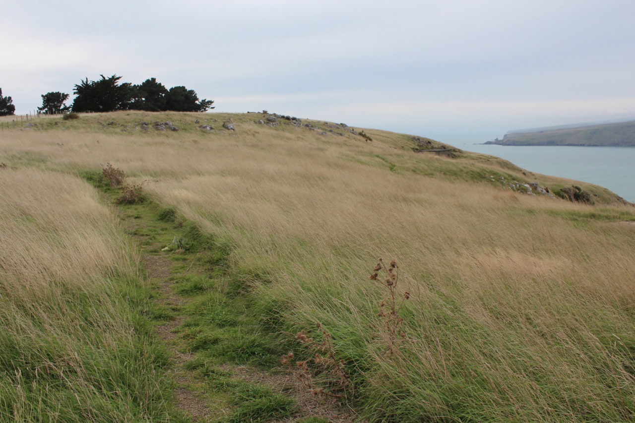 I saw a more grassy landscape at Godley Head Reserve, which once served as a military defense battery during WWII, the bunkers now abandoned and covered in graffiti. The grasses grow higher here probably because sheep browsing is restricted by fencing. There was no need for careful sidestepping along the walking paths. The headland is surrounded on three sides by steep cliffs that drop off to the ocean.