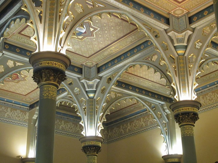 Walking into the bank lobby was quite a surprise. I’d never seen a bank interior like this one. It has to be one of the most ornate banking chambers in the world. The columns, capitals, arches and ceiling are richly detailed and gilded, like entering a Venetian palace.