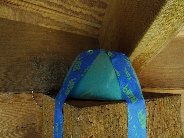 Earlier in the year, I started looking around for post caps that could change a post top’s contour. But, they were either too tall or costly. After the failure of the foil “remedy,” I went to the local home improvement store and eventually came across inexpensive melamine bowls that could be taped on to make an awkward and slippery surface. Wouldn’t you know that they happened to be the same color as robin eggs? As he was brushing off a proto-nest, Mr. Fixit got a face full of feathers when a robin swooped down on him, nearly making him fall off the ladder.