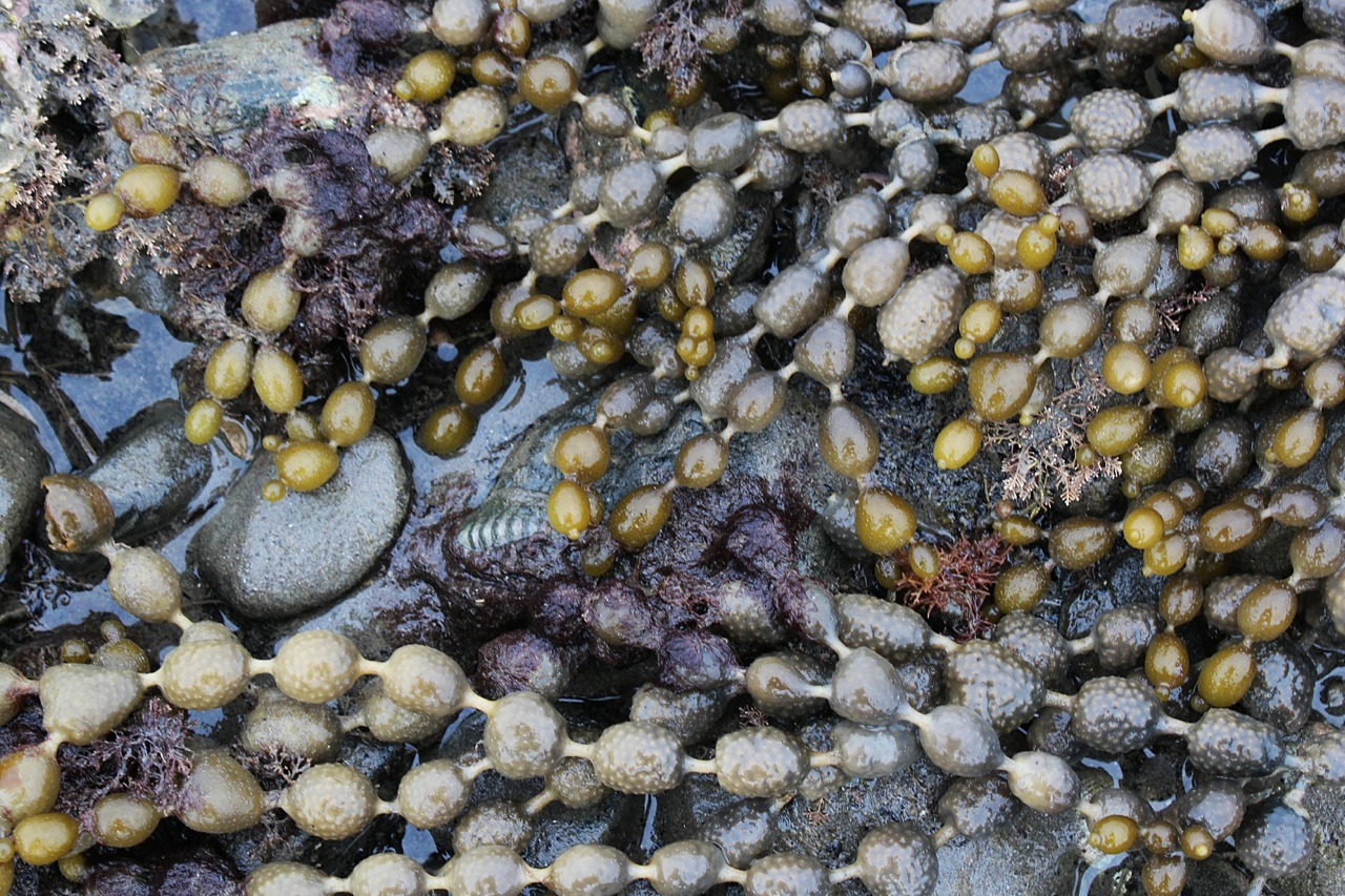 The tide pools reveal not only various forms of sea life, including small crabs, mollusks and sea cucumbers, but marine algae, including this most unusual-looking brown seaweed, hormosira banksii, commonly known as Neptune’s Necklace. They are found only in New Zealand and Australia. Besides jewelry, even children’s pop beads, they look to me like strung-together green olives.