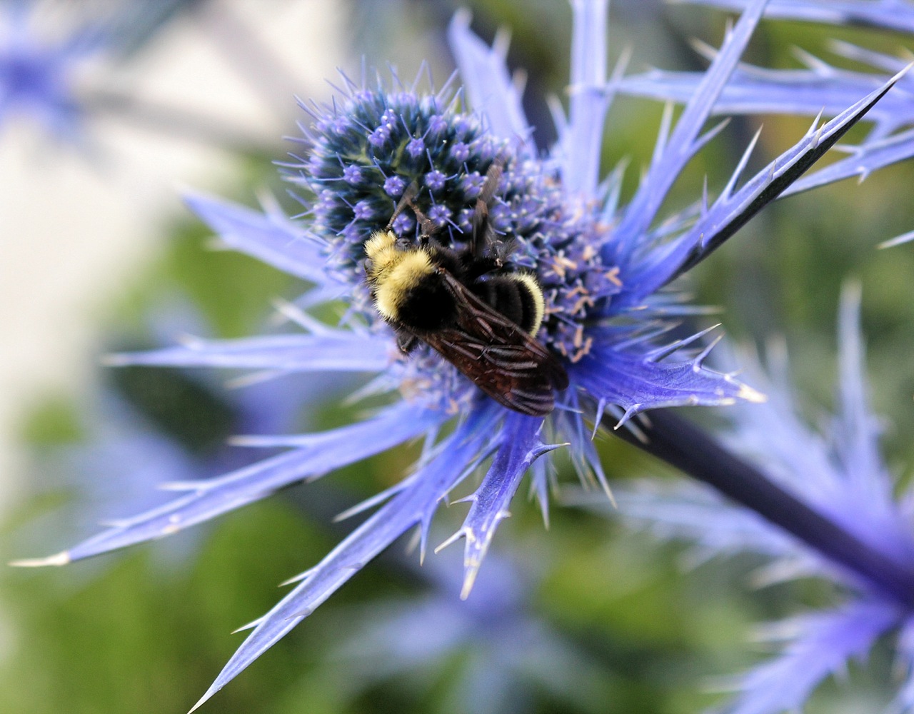 I was stopped in my tracks when I saw this thistle-like plant, cultivated in a garden outside Seattle’s Museum of History and Industry. What makes it unusual is the intense purplish-blue color of not only the blossom but the spiky leaves surrounding it. My guess is that it’s a false blue thistle. Regardless, the plants were attracting a lot of bees.