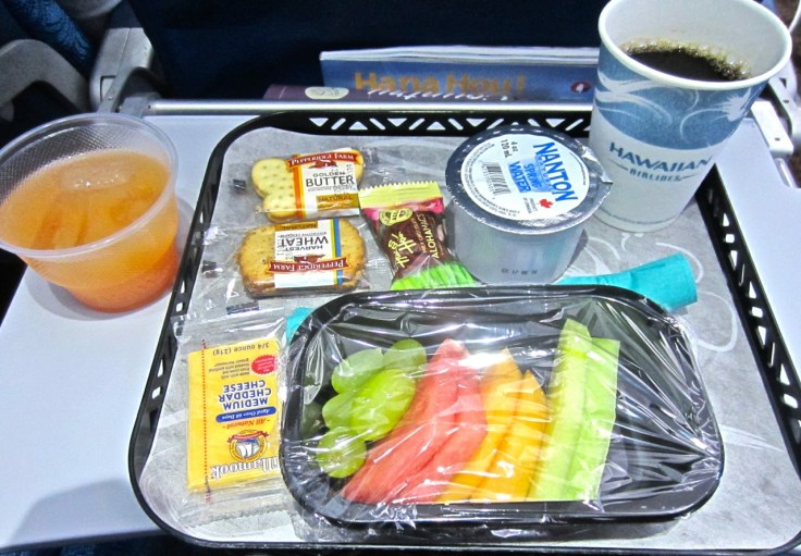 Am I missing something or does this breakfast look, um, ordinary? What island goodies showed up on the plate? A little bag of milk chocolate-covered macadamia nuts, that’s what. Oh, and a cup of complimentary passionfruit-orange-guava juice from a can. Fresh melons and grapes hardly qualify as tropical fruit. Pre-packaged crackers and cheese? Is this meal the best that Chef Chai could come up with? I didn’t expect first class quality, but at least something to whet my appetite for the island food I was looking forward to, now that my wife and I were headed to Hawaii. The breakfast was as uninspiring as the one we had on Hawaiian Airline’s morning flight from Auckland to Honolulu that I thought was an aberration, but apparently not. Hawaiian’s declaration may very well be true—and for that I should give them more credit—but couldn’t it make more effort to providing morning meals a little more interesting?