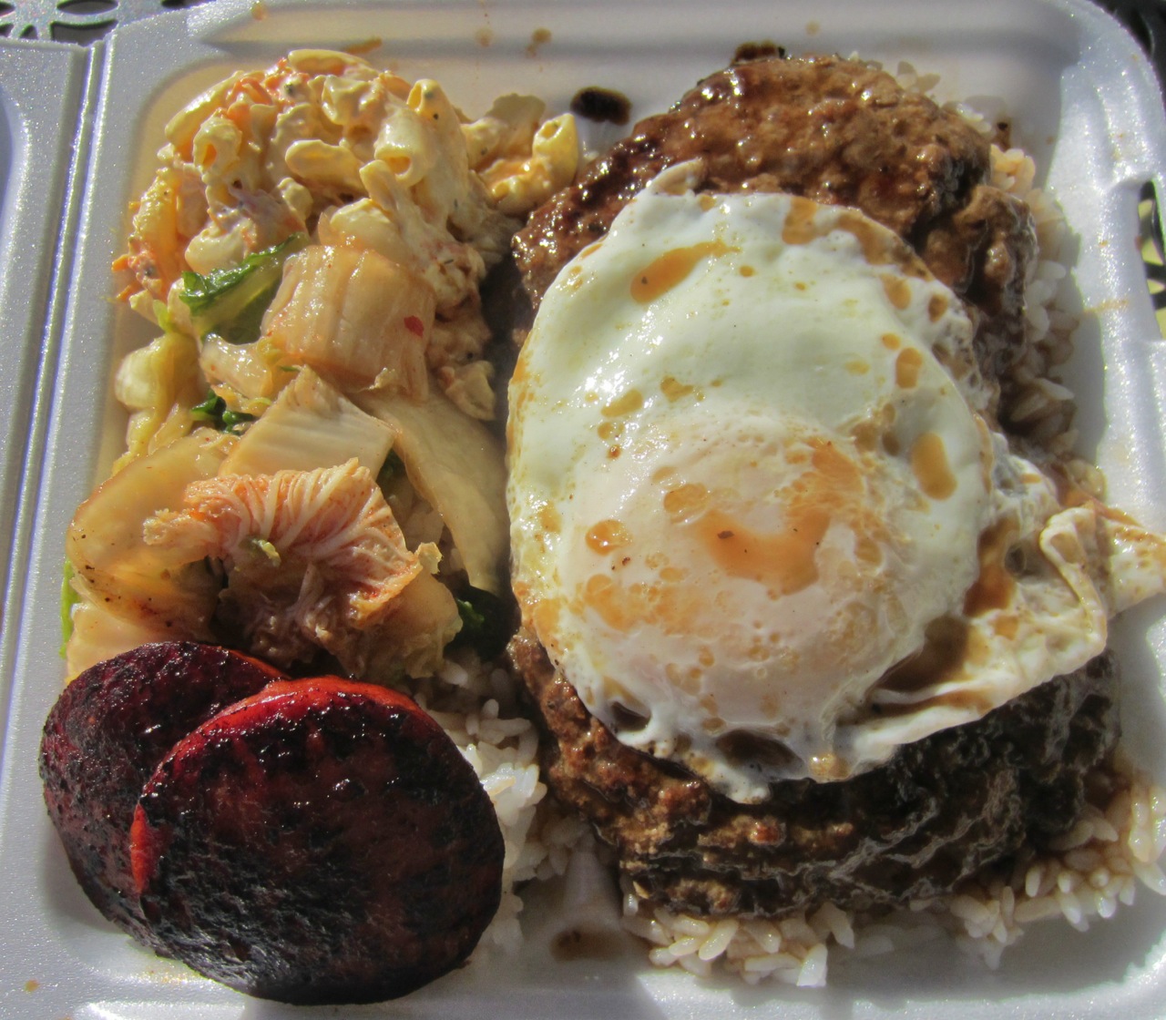 Loco moco, or the idea of it (patties covered in gravy over rice), has never appealed to me very much, not helped by the thought of dried out ground beef so common in burgers nowadays. I made an exception today because of its status among Koji’s customers. I’ll be the first to admit his loco moco was quite good. The gravy had teriyaki flavor. More importantly, the ground beef was tender, likely a combination of not being too lean and overly handled. The sausages were of high quality, nicely browned, and not too salty or chewy (like Hawaiian Style Cafe’s). The macaroni salad was one of the better ones I’ve had in Hawaii, the fried rice rather ordinary. The kimchi was typically Hawaiian-style. In short, Koji loco was a winnah (☆☆☆).