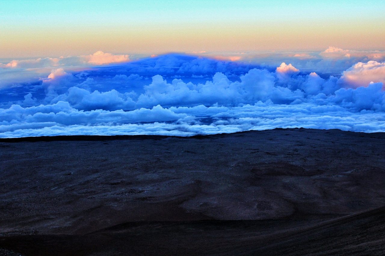 One of nature’s breathtaking anomalies happens almost every night at the summit of Mauna Kea, Hawaii’s majestic volcanic peak. Because of an inversion layer that pushes the often prodigious cloud cover several thousand feet below the summit, I witnessed just before sunset Mauna Kea’s giant triangular shadow being cast over the lid of the clouds to the east, like that of the Great Pyramid over the Sahara. For added drama, sulfuric acid particulates from Kilaeua wind up as a russet haze on the horizon.