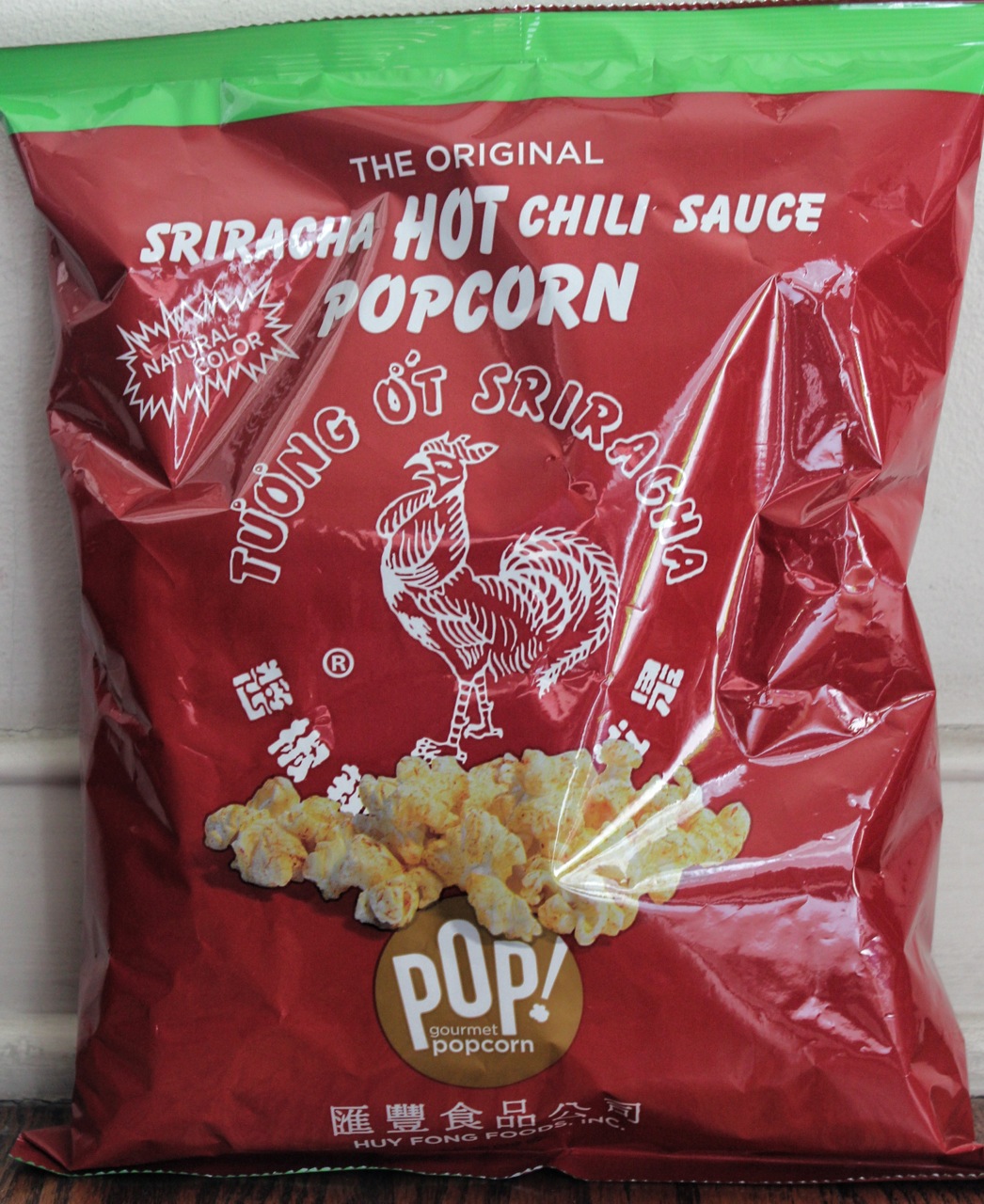 It had to happen. Likely the fastest growing condiment in the U.S. had to find its way into a popular snack. POP! Gourmet Popcorn, manufactured in Kent, Washington, near where I live, now offers popcorn flavored with Huy Fong Foods’ ubiquitous sriracha sauce. I found the bag at an Asian supermarket in San Gabriel, CA. The bag has the familiar green and roasted chile red colors that identify the bottle. At least one other sriracha popcorn has been made before, but none using ‘rooster sauce,’ as Huy Fong’s product is familiarly called.