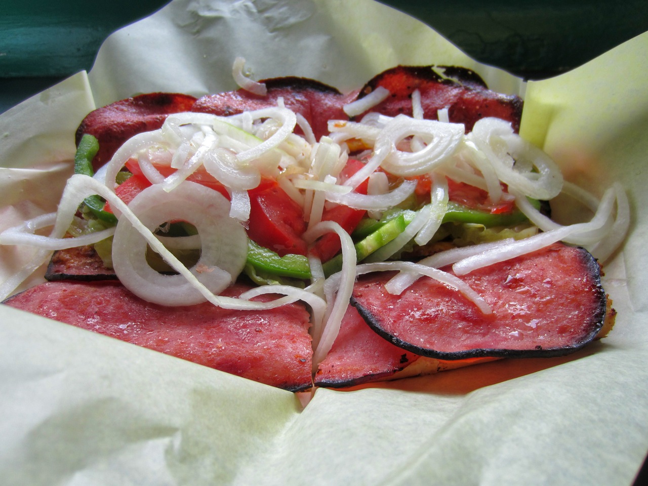 There are nine kinds of grinders, each with different fillings (including a vegetarian). All of them are served open-faced, exactly as they come out of the small, flat, stainless steel oven, like a pizza. And there the similarity to the pie doesn’t end because the bread is more pizza-like than, say, French roll, having a denser chew and developing a crackly exterior as it bakes. It is also thin, which places the emphasis as it should on the toppings. The ‘Garbage’ (image above) has salami, ham and pepperoni, two kinds of melted cheese (one of which is mozzarella) and their ‘secret’ sauce. After baking, the sandwich is topped with fresh vegetables: mild sliced onions, half moons of Roma tomatoes, green bell peppers, pickles, olive oil and something called EZ salt. Every sandwich is made-to-order, which can end up in a long wait when there are lots of customers, but the result is piping hot. Fold the sandwich over in half and eat. The Garbage Grinder (☆☆☆☆) is my third excellent dish I’ve enjoyed on this road trip.