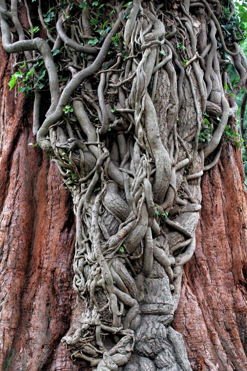 Hagley Park in Christchurch has some magnificent sequoia redwood specimens. I happened to be walking past one when I noticed something odd. Seemingly growing right out of the base of the trunk was an ivy, incredibly old by the looks of it, appearing more like tropical vines, a growth that needed to be cut out. It apparently is doing no damage to the tree. The more I stared at it, the more I admired its artistic effect and the chutzpah it took for the caretakers to leave it alone.