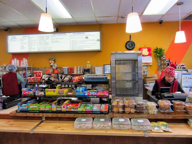 Toward the back is the food service area where prepared hot foods can be ordered and sandwiches made. A few tables inside let customers eat there instead of do take-out. A quick glance at the menu shows kinds of bành mì not readily found in other Vietnamese delis and bakeries. Some of the fillings include head cheese, shredded pork skin and, yes, teriyaki chicken.