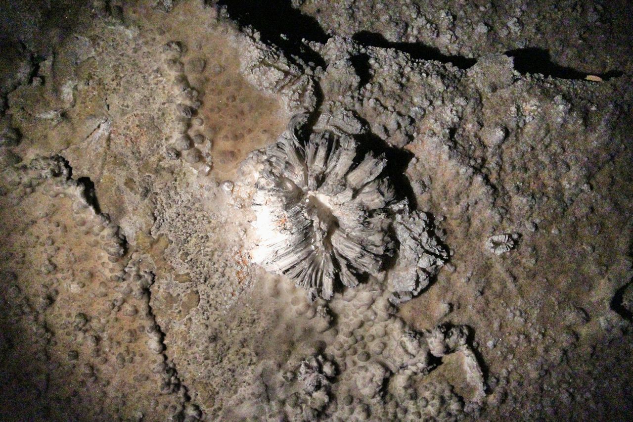 The usual speleotherms of stalactites, stalagmites and such, of wet cave environments were scarce, but there were plenty of gypsum accumulations (in the form of blisters and flowers) typical of dry caves, compliments of a hard layer of sandstone that acts like an almost impervious cap over the limestone underneath. These gypsum deposits are unimaginably slow growing at a rate of a dime’s thickness per century. One impressive example is Last Rose of Summer along Cleveland Avenue. There are prolific gypsum blisters in The Snowball Room, because they look like snowballs on the ceilings and walls.