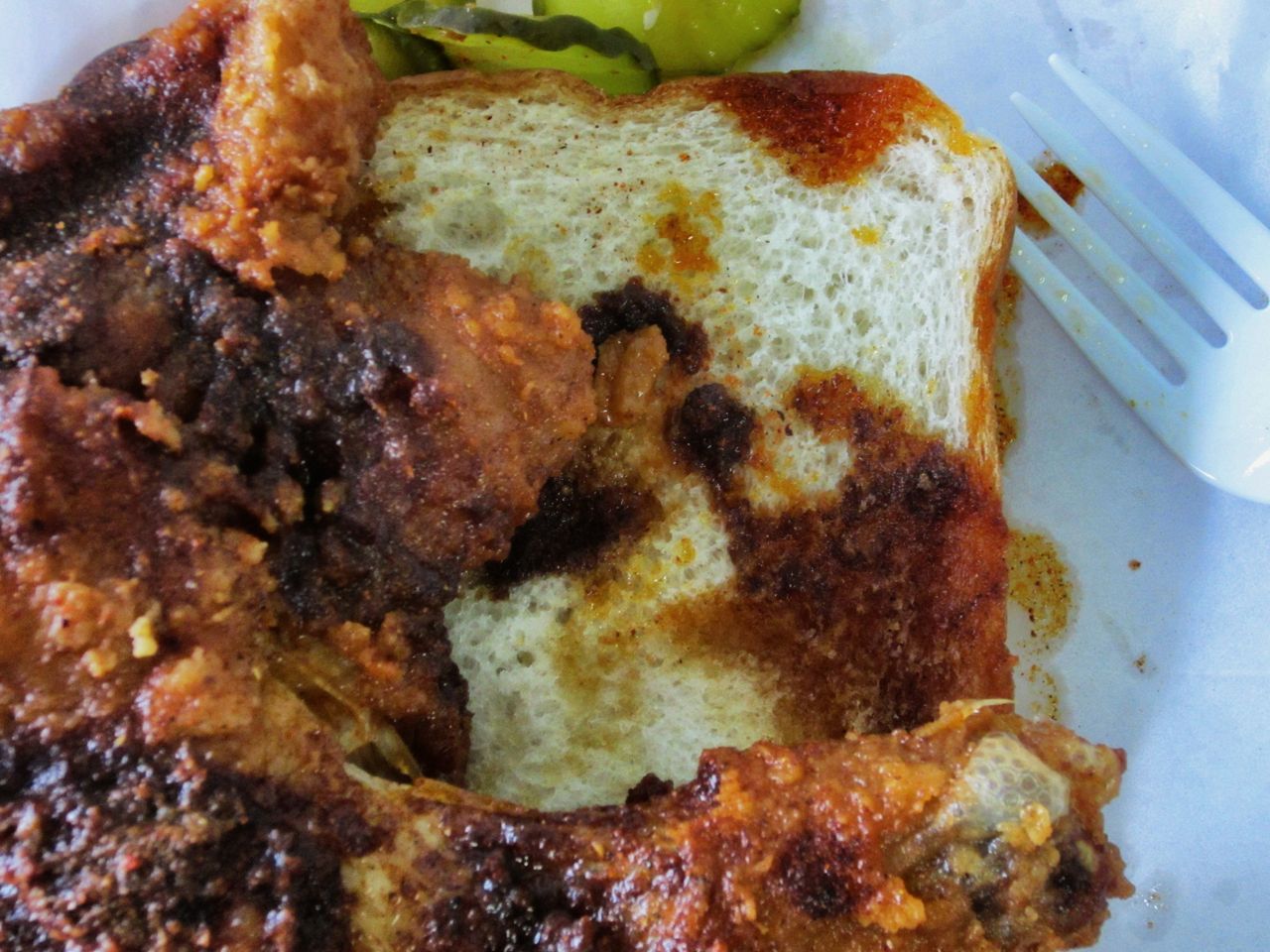 How spicy is the chicken? How does the proportion of 3 tablespoons of ground cayenne pepper to a tablespoon of lard sound? The chicken is served on top of white bread which soaks up the Godzilla sauce and grease, with sliced sour pickles served on the side.