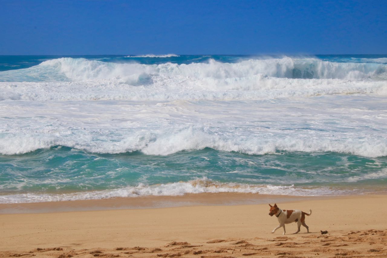 There’s nothing more mesmerizing than watching the huge, crashing surf at Ehukai Beach on Oahu’s North Shore, more commonly known as the Banzai Pipeline. Our traveling party sat on the warm sands, digesting our shrimp from Fumi’s and chocolate-haupia pie from Ted’s Bakery, when a dog came trotting along the swash, not in the least bothered by the turmoil close by.