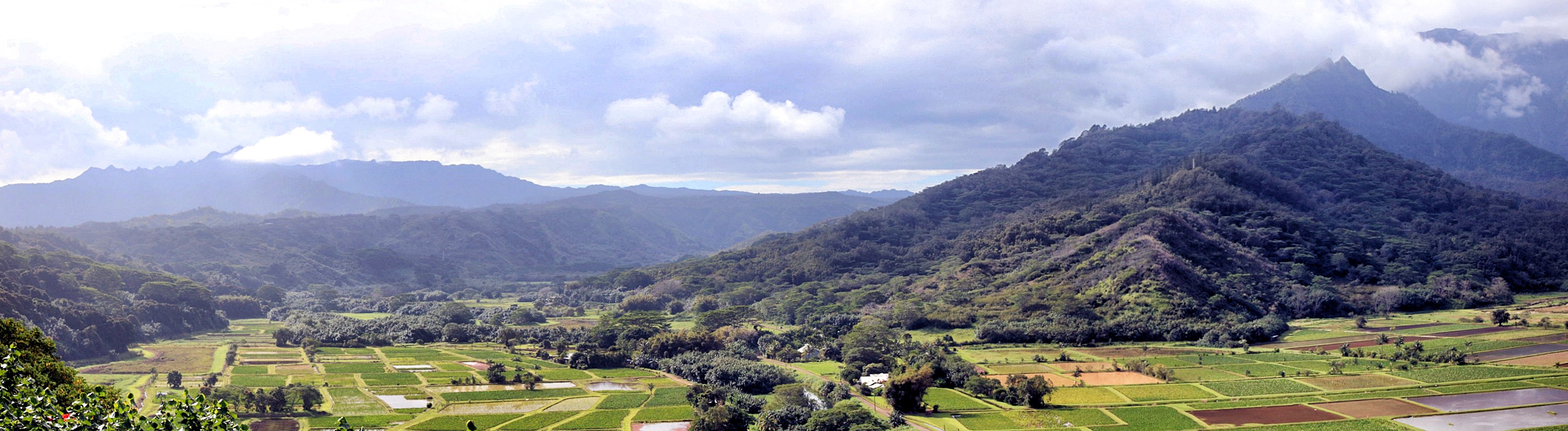 Kauai has lots of taro fields. Not that the Garden Isle has exclusive claim to them, but the North Shore is considered the best place on the Islands to grow taro. Over half of all poi in Hawaii is made from Kauai taro. Around Hanalei, you drive past the fields on all sides. The largest farm in Hawaii is here (Haraguchi Farm). In Princeville, the Hanalei Valley Overlook has a commanding view of the fields against a spectacular backdrop of waterfalls and mountains, including the twin peaks of Hihimanu.
