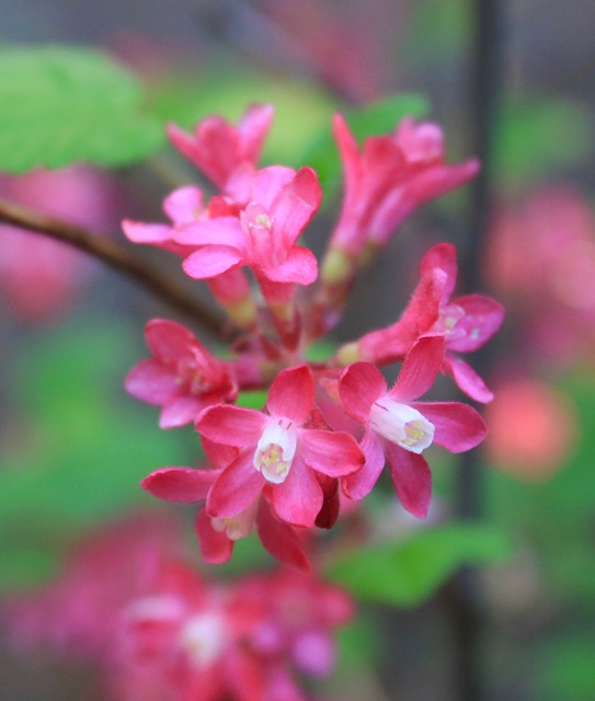 In the next few months, my wife and I will be conditioning ourselves for a trip to Peru and Bolivia later in the year. High-altitude hiking in the Andes will be punishing enough without even taking into consideration demand on legs, knees and lungs. Our first real hike of the year was yesterday, the popular Little Si Trail that starts in North Bend. (The mountain is called Little Si because it stands next to the bigger Mount Si.) The trail gains a bit over 1,100ft over its 2.2-mile length, so there wasn’t enormous pulmonary challenge, but our quad muscles and knees took a lot of punishment. Still, we had a wonderful time outside and enjoyed the scenery along the way, including beautiful forests and view of Mount Si and the Snoqualmie valley from the trail summit. We also noticed the season’s first wildflowers, which I could count on one hand. The flowers pictured above belong to the red-flowering currant (Ribes sanguineum).