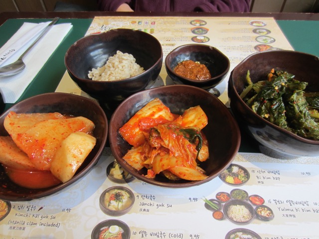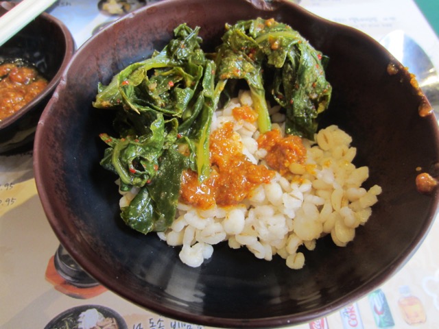 Instead of banchan, a sort of appetizer is served. A bowl of steamed barley is accompanied by three kinds of kimchi—cabbage, daikon radish and young radish leaves (yeolmu)—as well as a gochujang miso paste (dwaenjang) that can be daubed on the barley with a little sesame oil.