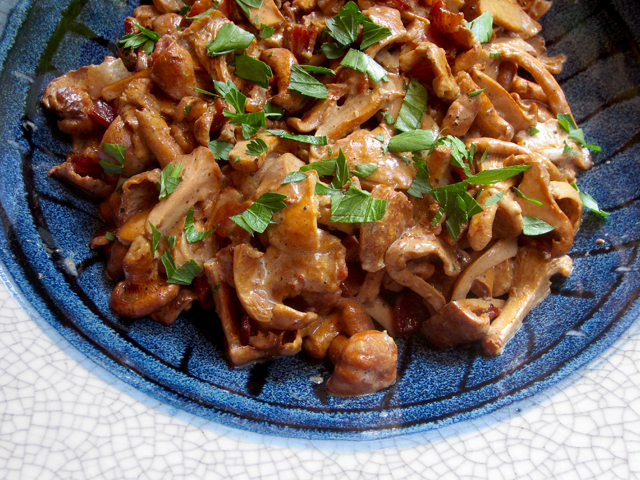 Now is not the chanterelle season here in the Pacific Northwest, so it was a bit of a surprise to see the wild mushrooms at Costco last week. One pound for $8.99 was too hard to pass up. Even if eating light and local is what’s called for in the warm days of summer, chanterelles and smoked bacon together are hard to beat any time of year.