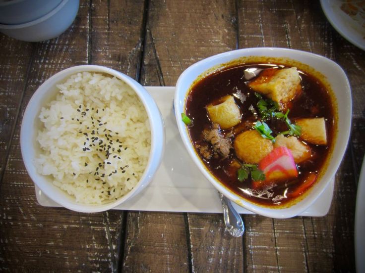 The best dish was a terrific example of mala in which a sauce or broth is peppery and quite spicy. Spicy Mala Beef mostly had various kinds of fish cake, served with a bowl of sesame-sprinkled rice. A small amount of rice in a separate bowl helped to temper a scoop of the fiery soup ladled over it; still there was plenty of nose-blowing.